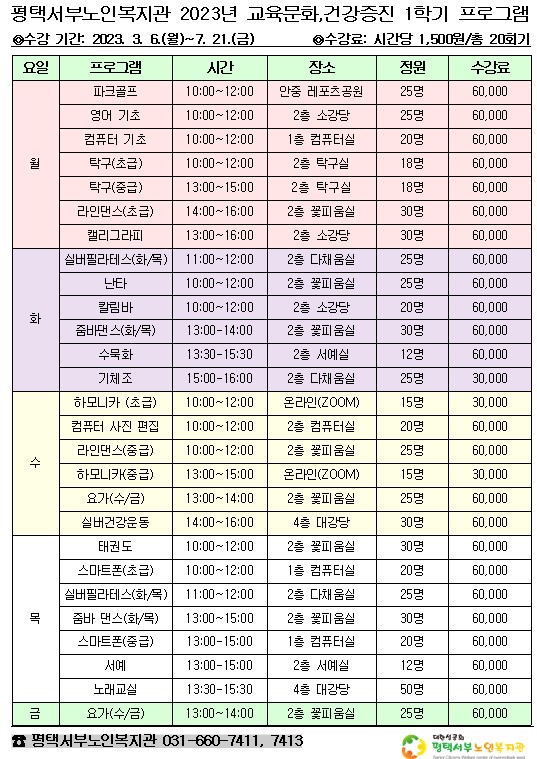 2023년 1학기 교육문화, 건강증진 프로그램 시간표 페이지 정보 작성자 서부노인복지 작성일23-02-13 09:58 조회8,084회 댓글0건 관련링크 이전글 다음글 목록 본문 . [이 게시물은 서부노인복지님에 의해 2025-07-08 11:56:08 교육문화프로그램 시간표에서 이동 됨] 댓글목록 등록된 댓글이 없습니다. 이전글 다음글 목록