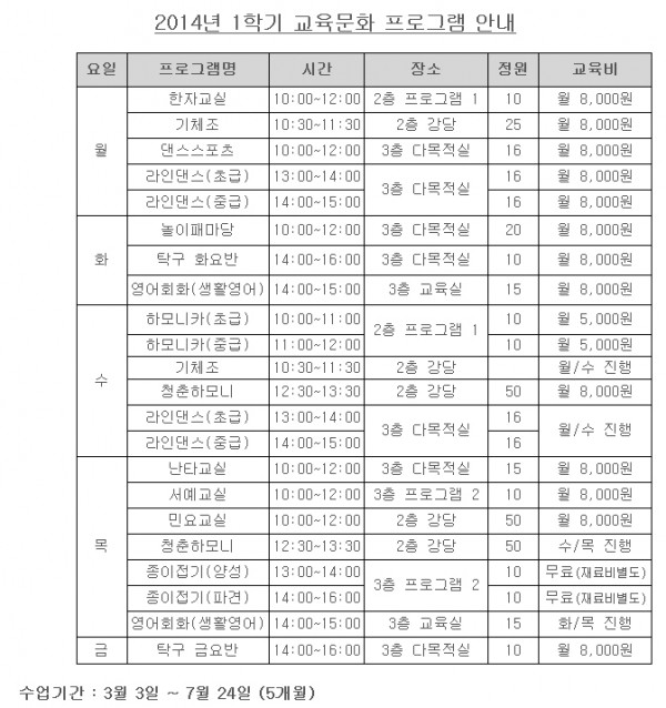 2014년 1학기 교육문화 프로그램 안내 페이지 정보 작성자 서부노인복지 작성일14-08-04 16:04 조회12,424회 댓글0건 관련링크 이전글 다음글 목록 본문 2014년 1학기 교육문화 프로그램 안내 [이 게시물은 서부노인복지님에 의해 2025-07-08 11:56:18 교육문화프로그램 시간표에서 이동 됨] 댓글목록 등록된 댓글이 없습니다. 이전글 다음글 목록