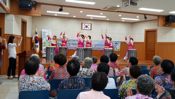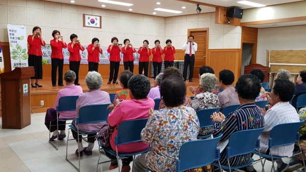 2018년 9월 17일 월요일 두드림 실버봉사단이 서부노인복지관의 사업인 이동복지관 수료식에서 하모니카와 난타 공연을 선보이고 왔습니다.