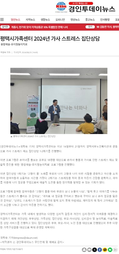 가족센터 2024년 가사 스트레스 집단상담 페이지 정보 작성자 서부노인복지 작성일24-09-02 11:34 조회2,192회 댓글0건 관련링크 이전글 다음글 목록 본문 평택시가족센터 2024년 가사 스트레스 집단상담:경인투데이뉴스 (ktin.net) 댓글목록 등록된 댓글이 없습니다. 이전글 다음글 목록