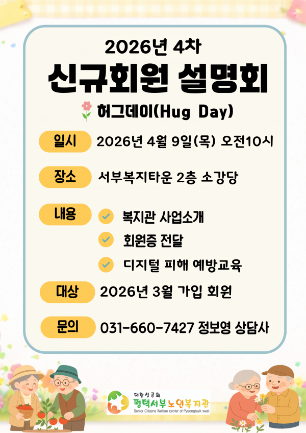 공지 | 2026년 제4차 신입회원설명회 안내 페이지 정보 작성자 서부노인복지 작성일26-04-01 15:49 조회9회 댓글0건 관련링크 다음글 목록 본문 평택서부노인복지관 제 4차 신입회원설명회 안내드립니다. 모두 참석하셔서 더 즐거운 복지관 생활로 행복해지세요^^ 댓글목록 등록된 댓글이 없습니다. 다음글 목록