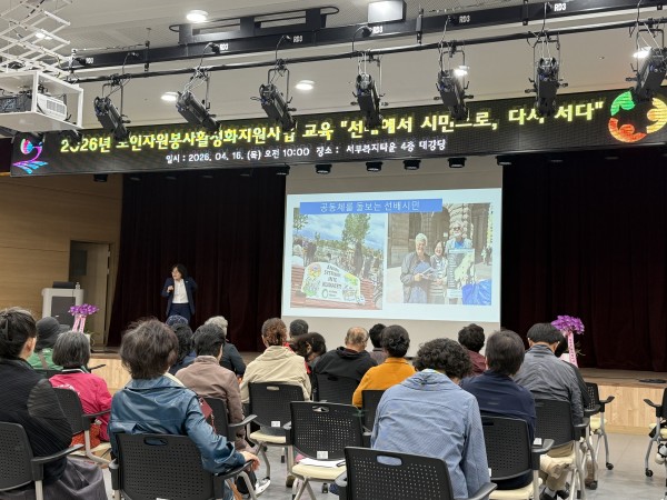 한국노인종합복지관협회의 지원으로 진행하는 2026년 노인자원봉사활성화지원사업 선배시민 1차 교육이 2026.4.16(목), 10:00 복지타운 4층 대강당에서 열렸습니다.